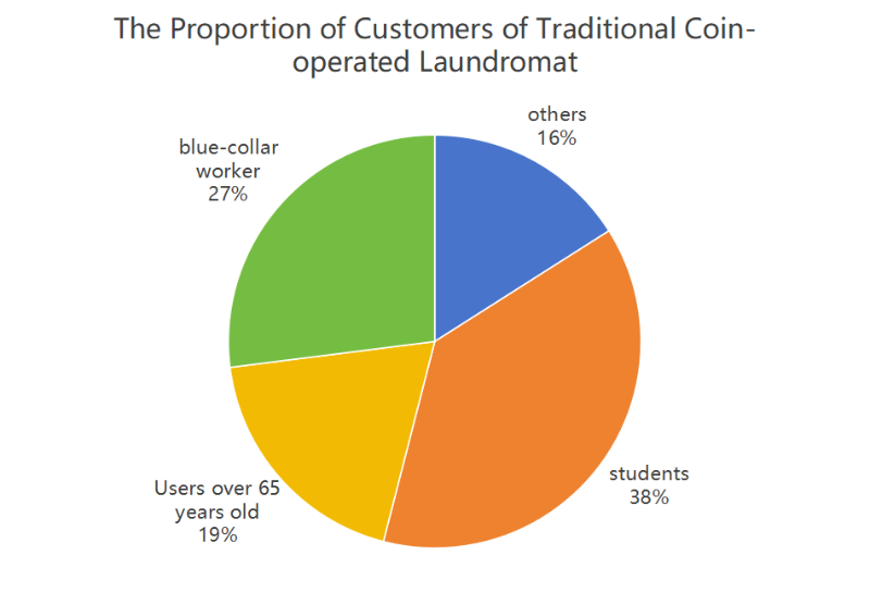 Traditionell myntdriven tvätt torr konto s för 42 procent av den globala självbetjäningsmarknaden, med studenter som står för 38 procent (enligt American Laundry Association), arbetare (27 procent) och äldre användare (19 procent över 65).